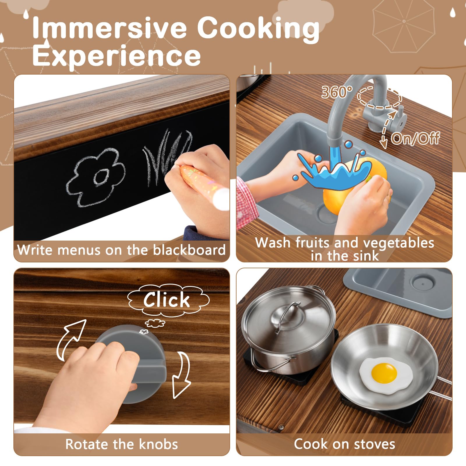 - 【Imaginative Outdoor Play】 Our mud kitchen features a spacious countertop with stoves and pots for mixing, stirring, and concocting mud pies, plus a removable sink for easy cleanup. The rotatable knobs with a “click” sound adds more fun. Kids can also write menus on the blackboard.