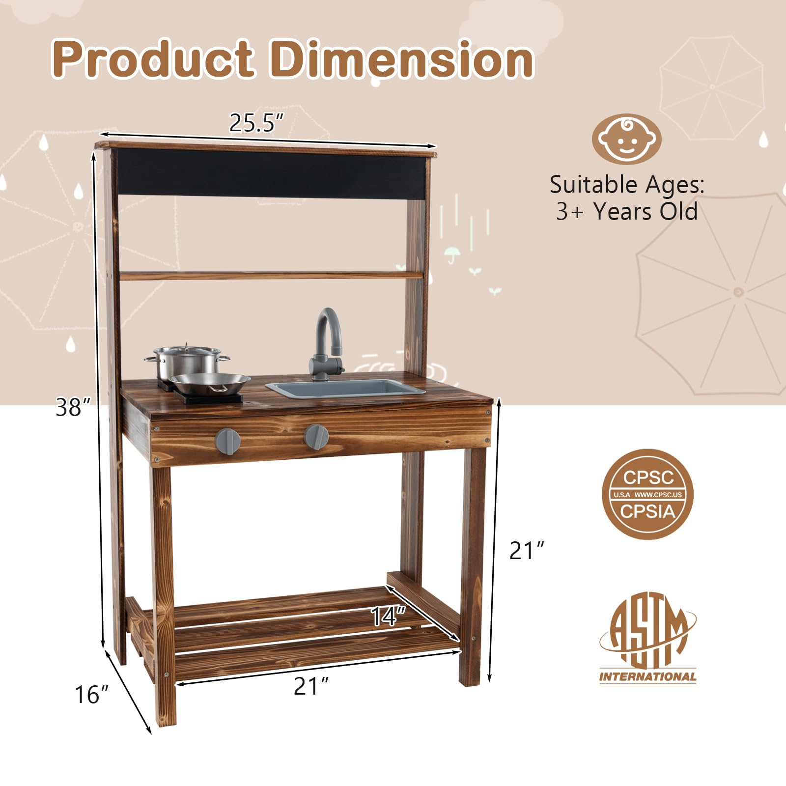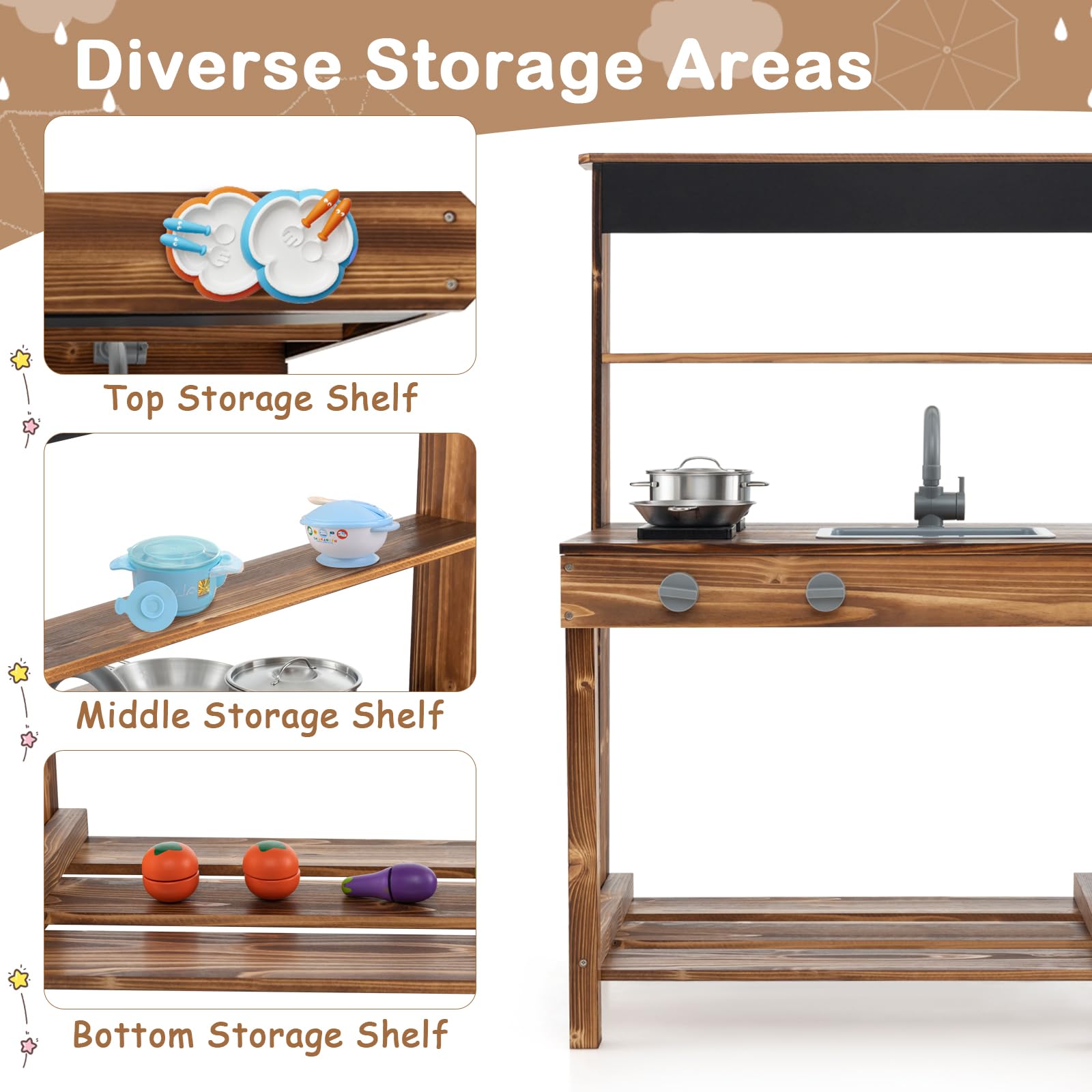 - 【Organized Storage Solution】 This wooden mud table for kids offers ample storage spaces on the top and bottom shelves, keeping cooking accessories within reach for little chefs. It helps kids improve responsibility and order while indulging in outdoor kitchen play.