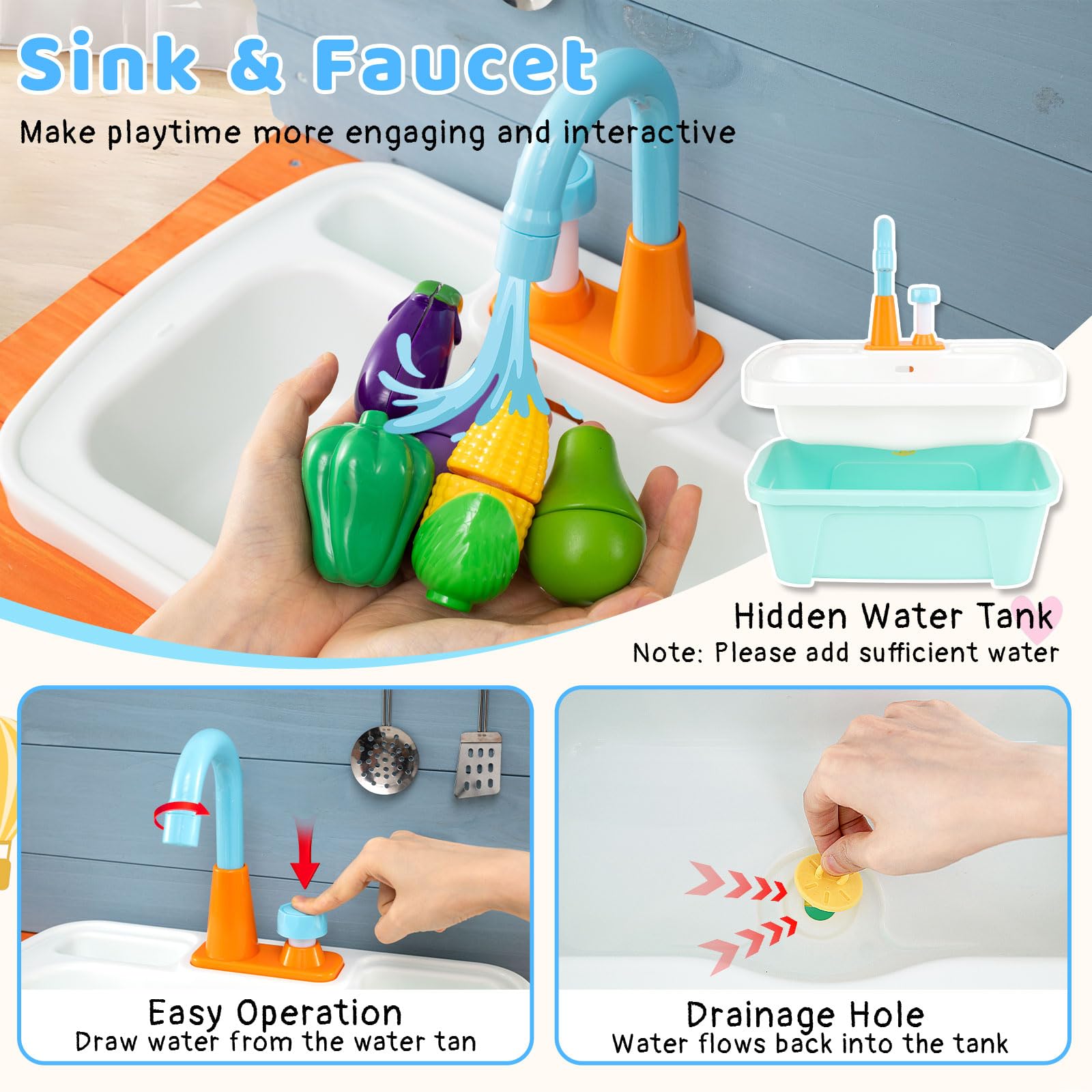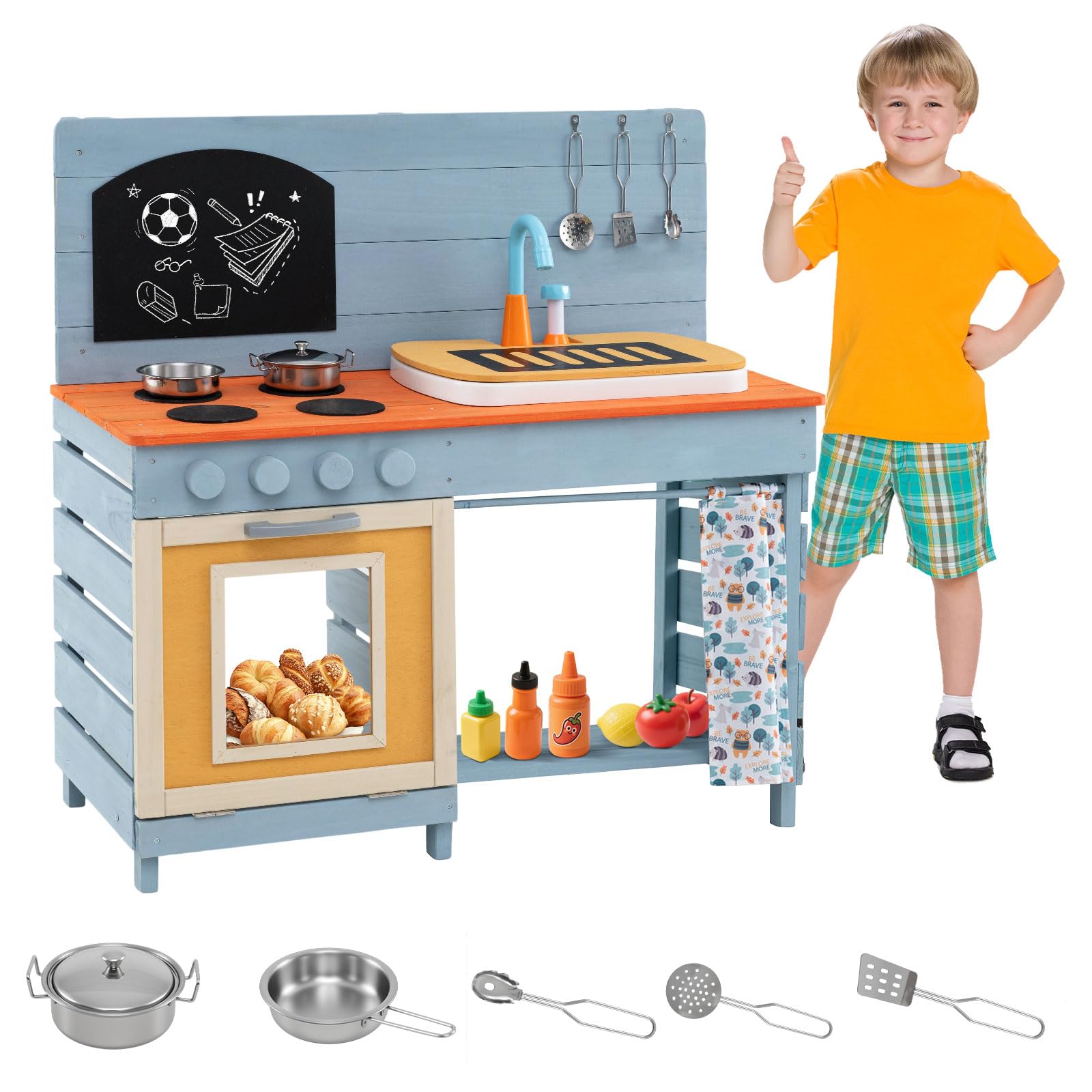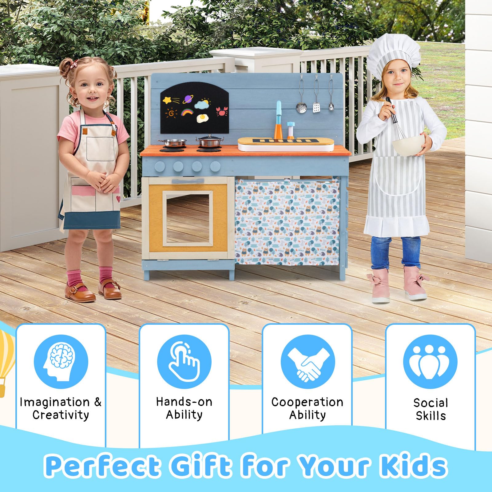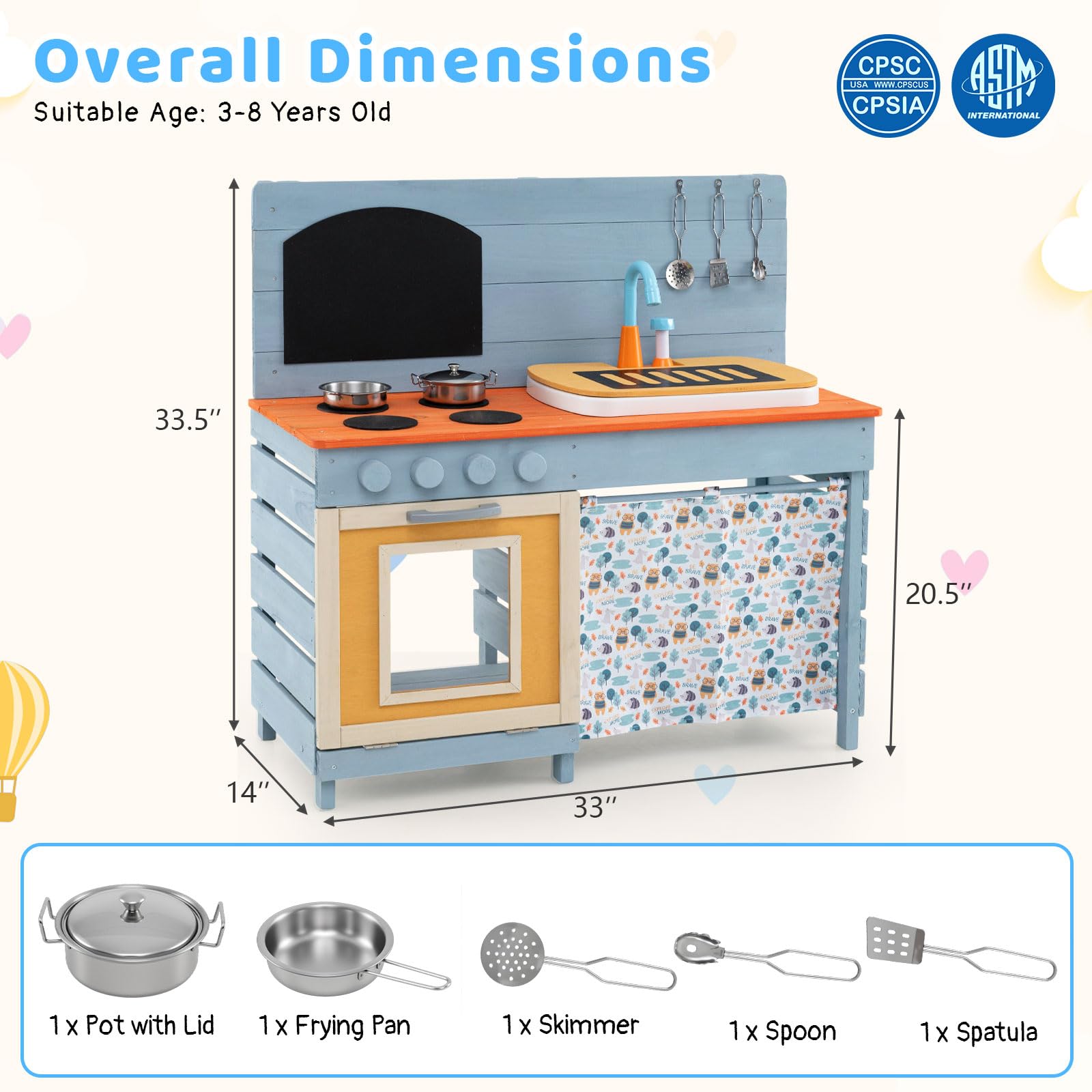 This wooden kitchen playset features a grill rack, stoves, rotation knobs and removable sink, mimicking the essential elements of a real kitchen. The circulation faucet with a hidden water tank allows children to engage in realistic water play. Enhance your child's creative development with an integrated chalkboard where they can write menus or draw. Built to last, the kitchen playset is well-crafted with sturdy wooden construction. Equipped with shelves and cabinets, this outdoor mud kitchen offers ample storage for cooking accessories and flowerpots. Watch your child develop important life skills while delighting in the joy of pretend cooking.