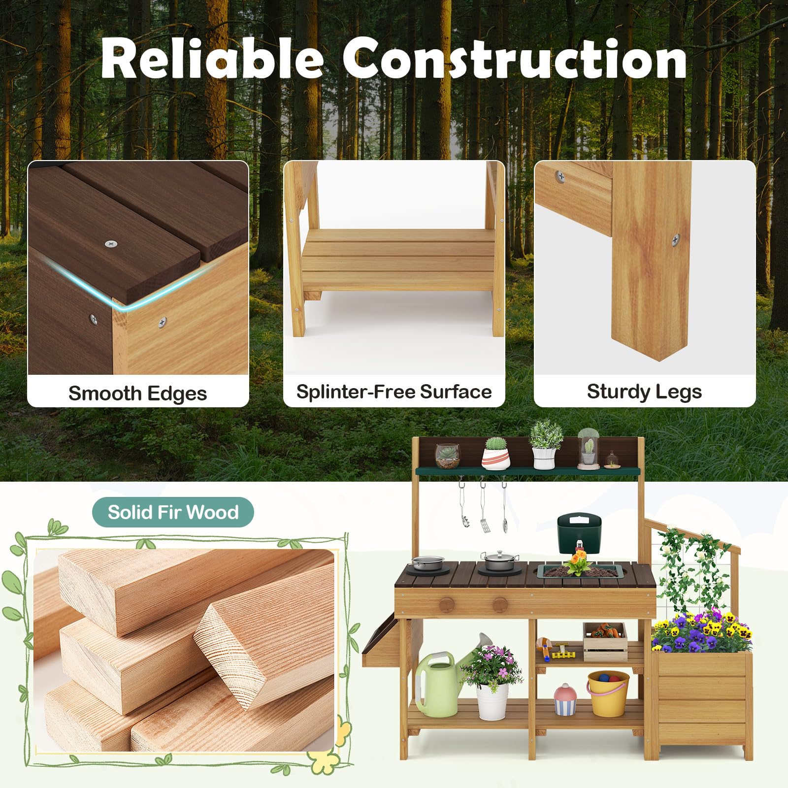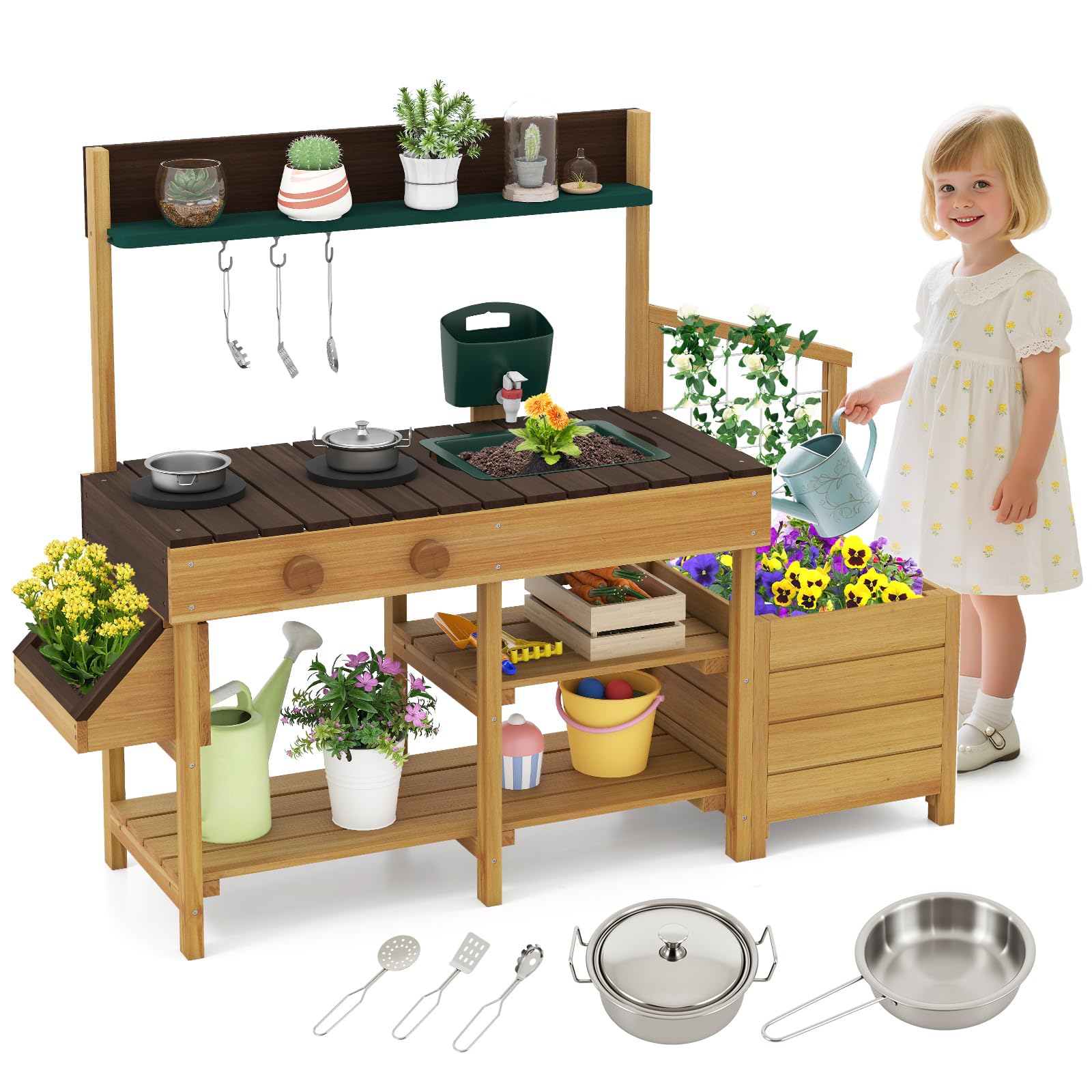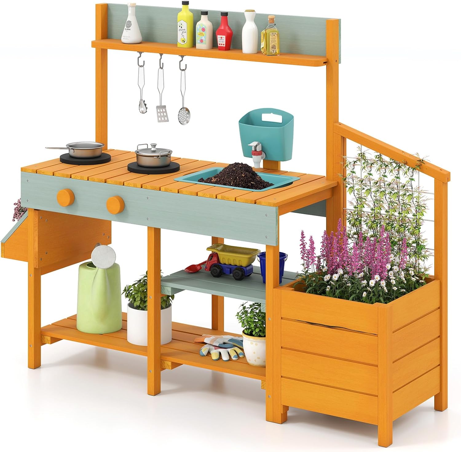 Encourage imaginative play and motor skill development with a kids mud kitchen featuring a removable sink and faucet for sand, water, and mud fun. Get closer to nature with 2 planter boxes and a trellis, while enjoying pretend cooking on 2 stoves and 2 rotation knobs with cooking accessories. The sturdy wood construction ensures stability and safety, mimicking a real kitchen for imaginative meal prep. Organize kid’s treasures with storage shelves and hanging hooks, making it a perfect gift for children aged 3-8 to enhance their playing experience and organizational skills.