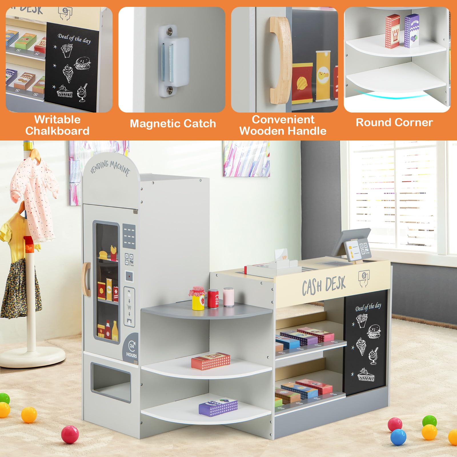 - ?【Supermarket Role Play】This versatile grocery store playset is designed with realistic features like checkout counter, vending machine, goods racks to provide kids with an immersive selling and shopping experience. With the interactive simulation vending machine, little clerk can put goods in the machine, kids can select and purchase, then take out the food or drinks.