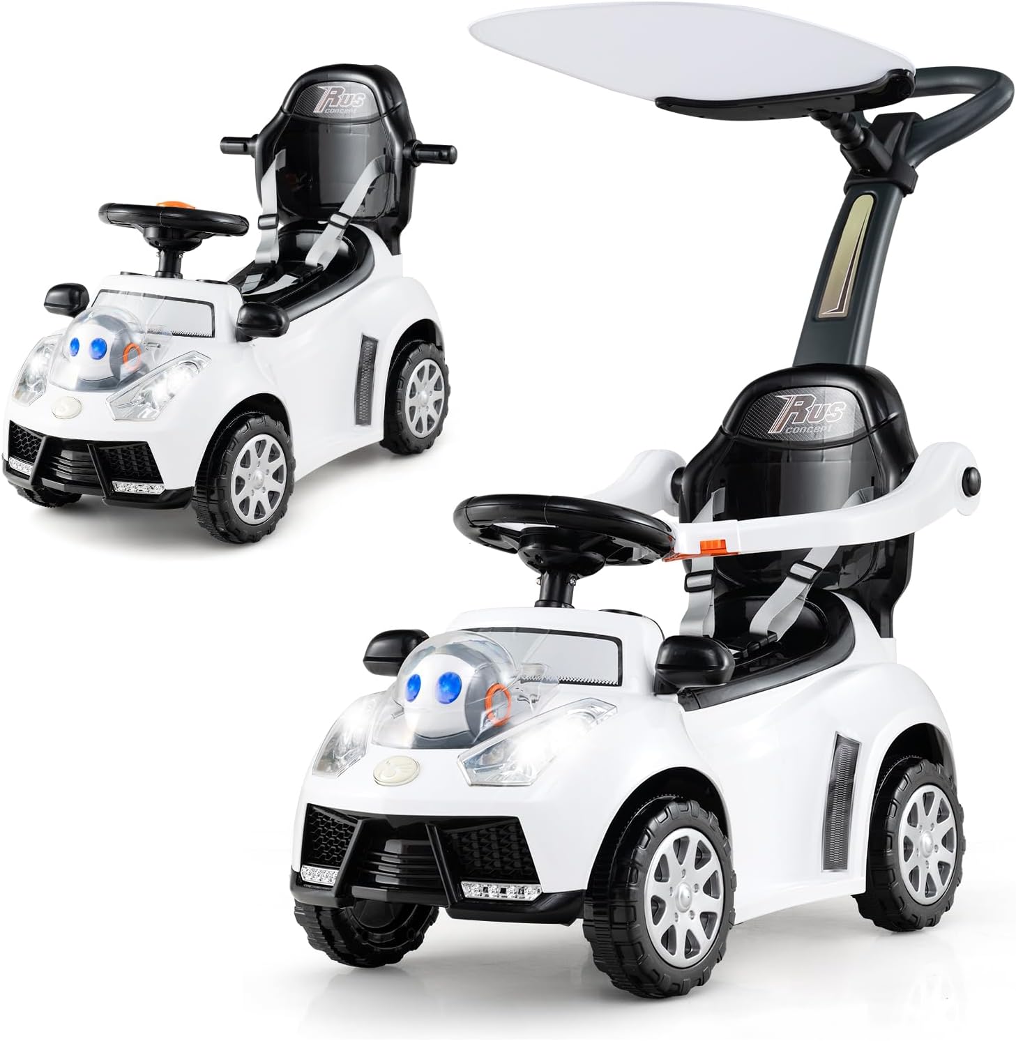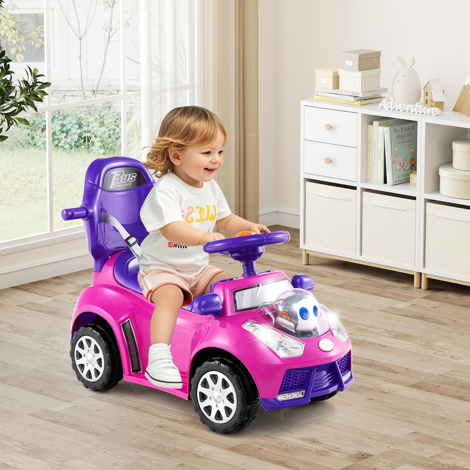 From a parent-guided push car for the littlest ones to a fun-filled ride-on toy for the more adventurous toddlers, this ride on toy provides endless entertainment and developmental benefits for your little one. Moreover, the realistic steering wheel, interactive buttons with horn, lights and music ensure a delightful driving experience, while safety features like the seat belt, guardrail and anti-slip pedals provide peace of mind. Added comforts like a cozy seat, adjustable canopy and hidden storage under the seat make every trip enjoyable, turning every ride into a treasure-filled adventure with ease and joy.