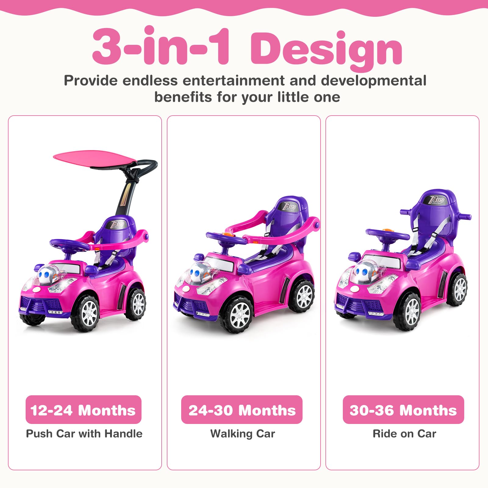 Our 3-in-1 push car is designed to adapt to your child’s developmental stages, providing endless fun and excitement for boys and girls aged 1+ years old.