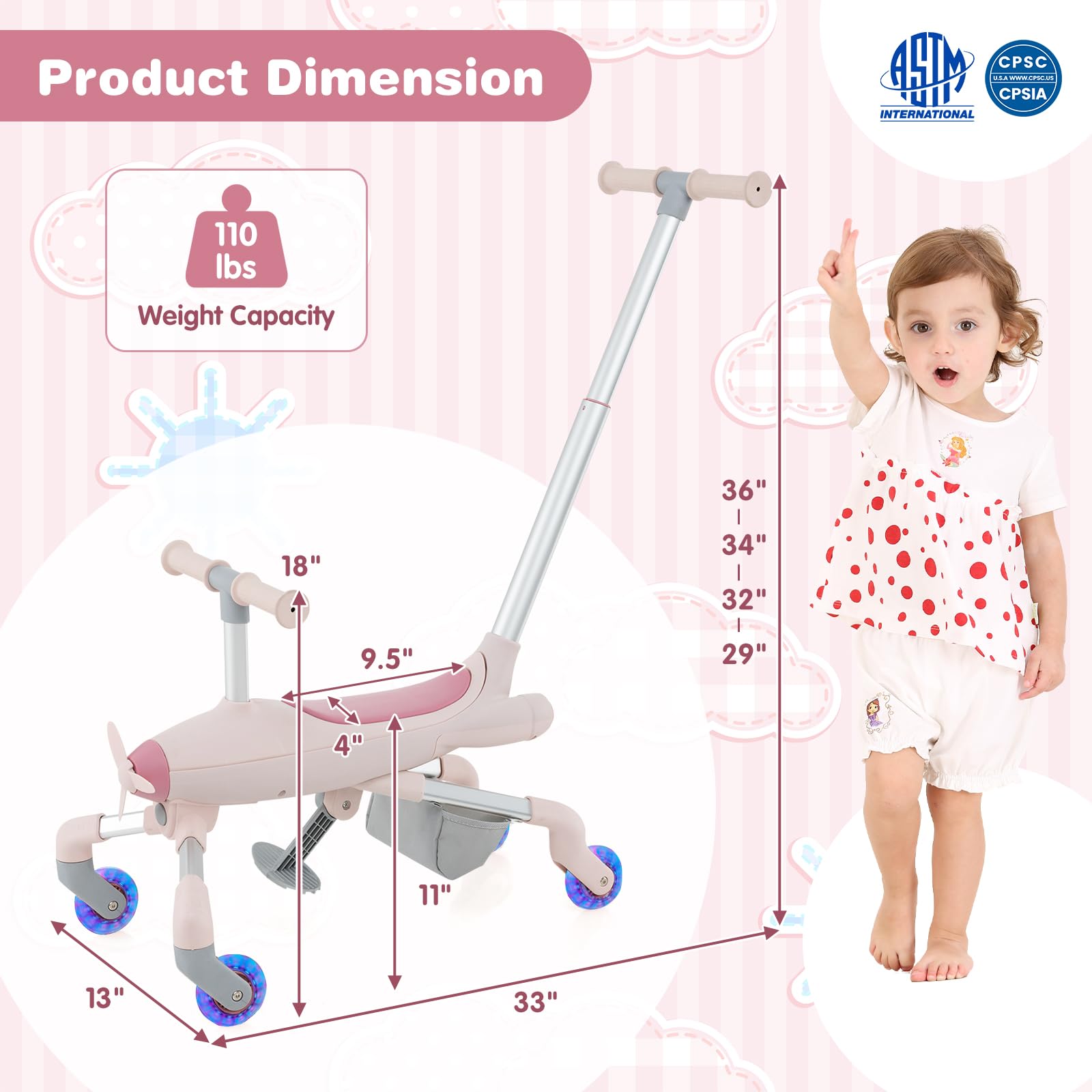 This ride on push car switches between a parent-push mode and a child-driven mode, catering to kids of varying ages. Ensuring the coziness of parents, the ride on toy features a 4-position adjustable parent handle with a detachable design. While the anti-slip handlebars and cozy PU seat provide comfort for kids. Never lacking in entertainment, the push car includes colorful LED lights for unparalleled fun. Crafted with premium aluminum tubes and PU wheels, this push car is built to last as your child grows. Additionally, the large storage basket allows for easy access to toys and items. Boasting a plane-themed design, this ride on toy car is the perfect gift for children aged 18-60 months old. It enhances the development of confidence, balance, and motor skills, while also fostering parent-child interaction.