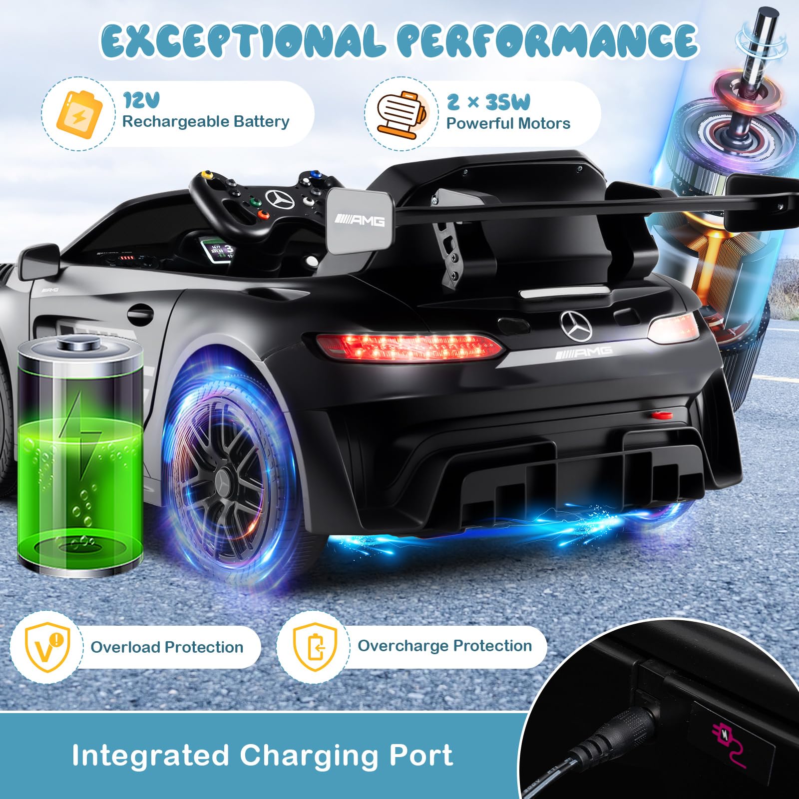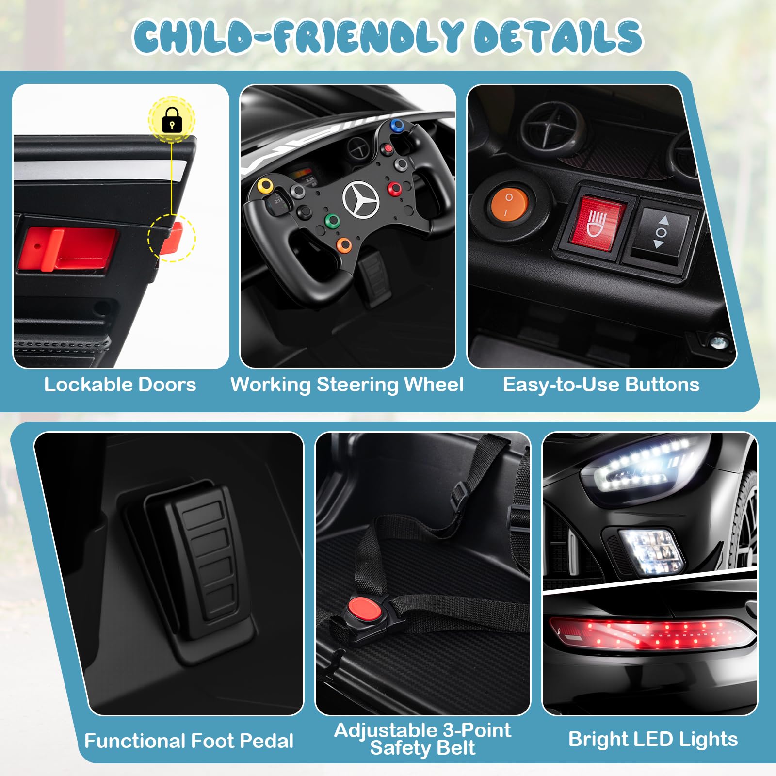 The electric car for kids, inspired by the sleek design of a Mercedes-AMG GT3, is an ideal gift for children above 3 years old. With dual 35W motors and a 12V battery, the fun can last for hours on end. Not only can parents control with the equipped remote, but kids can also drive this battery powered electric vehicle using the steering wheel, buttons and foot pedal. The music and wireless connectivity make each ride delightful, while the lockable doors and adjustable 3-point safety belt render your child safe. The premium wheels, along with soft start and stop mechanisms, ensure unlimited joy on different roads. When it's time to go, you can easily transport the ride on toy car with the convenient carry handle and wheels.