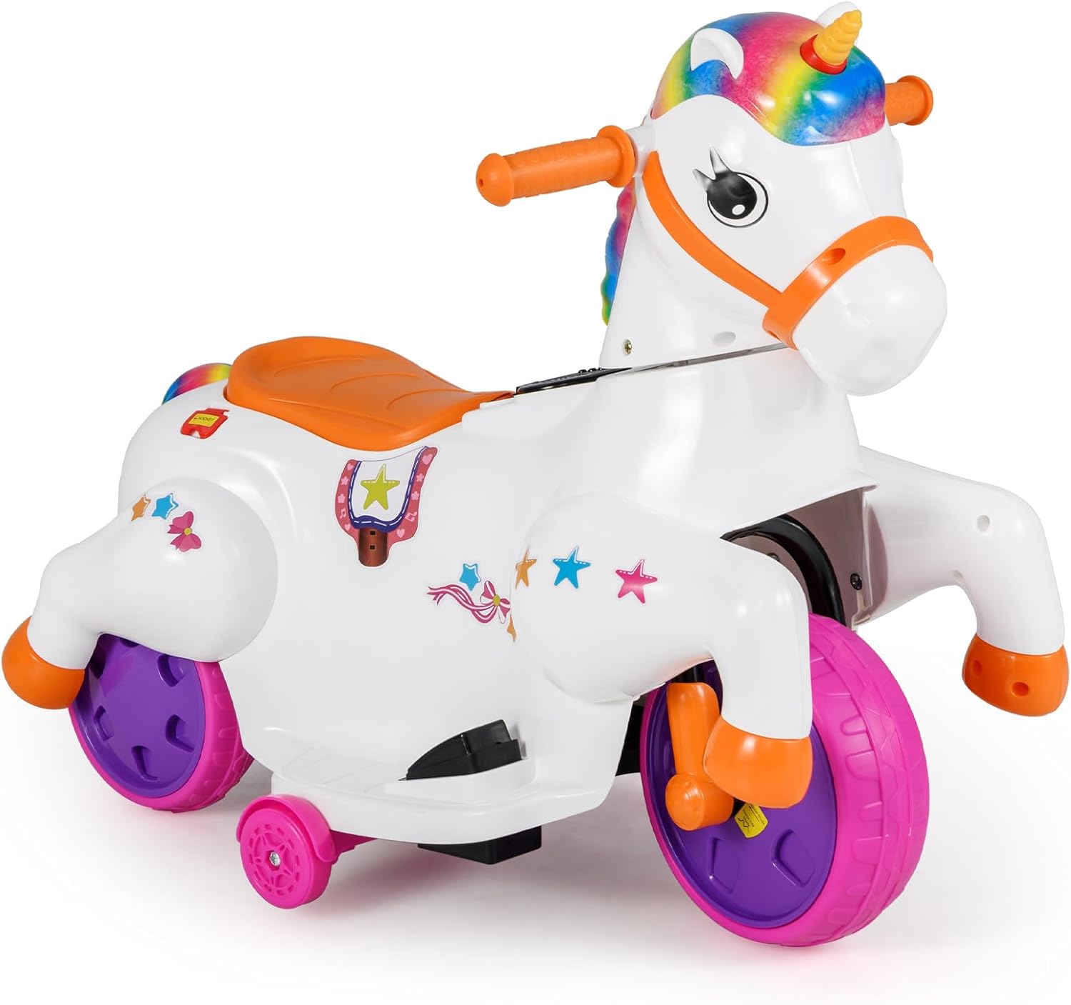 - Easy Operation for Convenience: The ride on horse boasts a one-button start, a foot pedal, and an intuitive direction button for effortless driving. Besides, the toy car has a music button that adds a soundtrack to your child's adventures.
