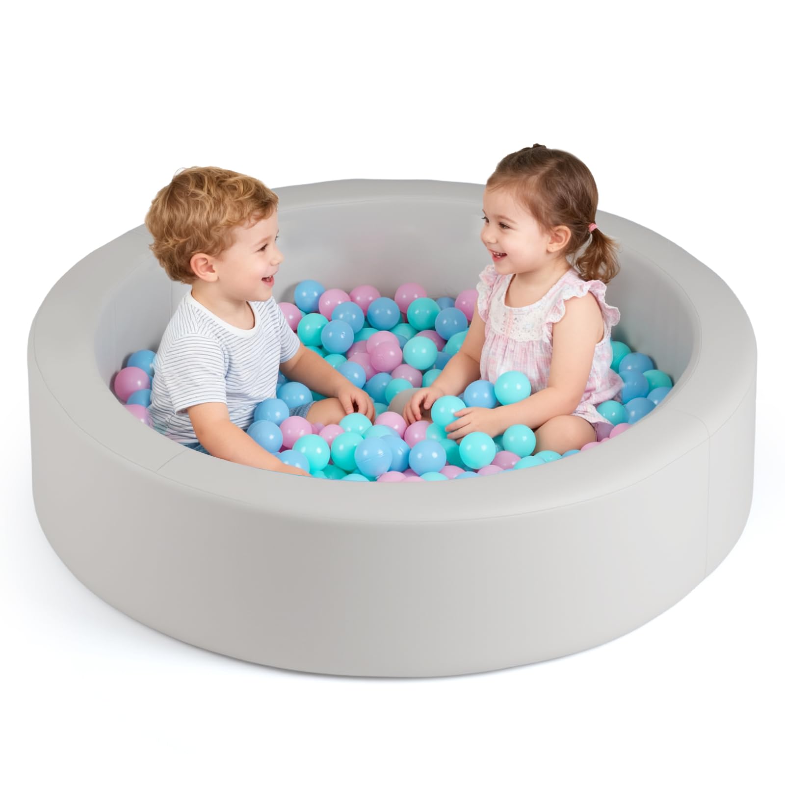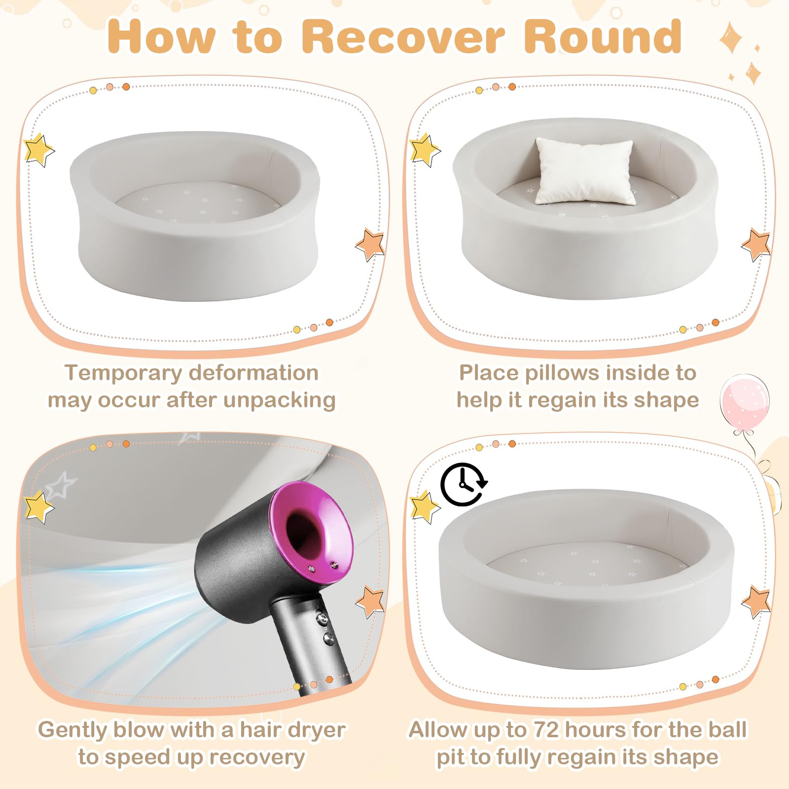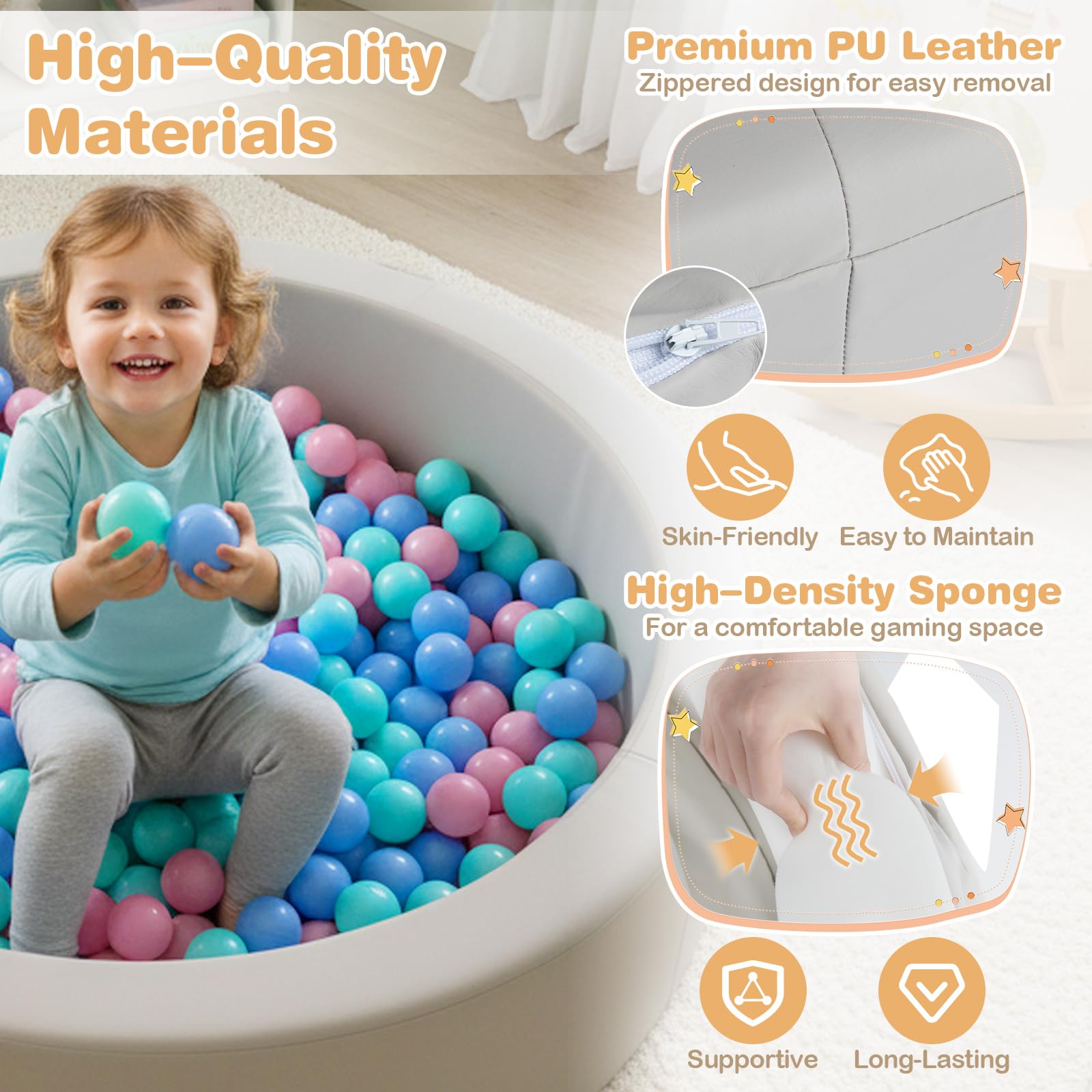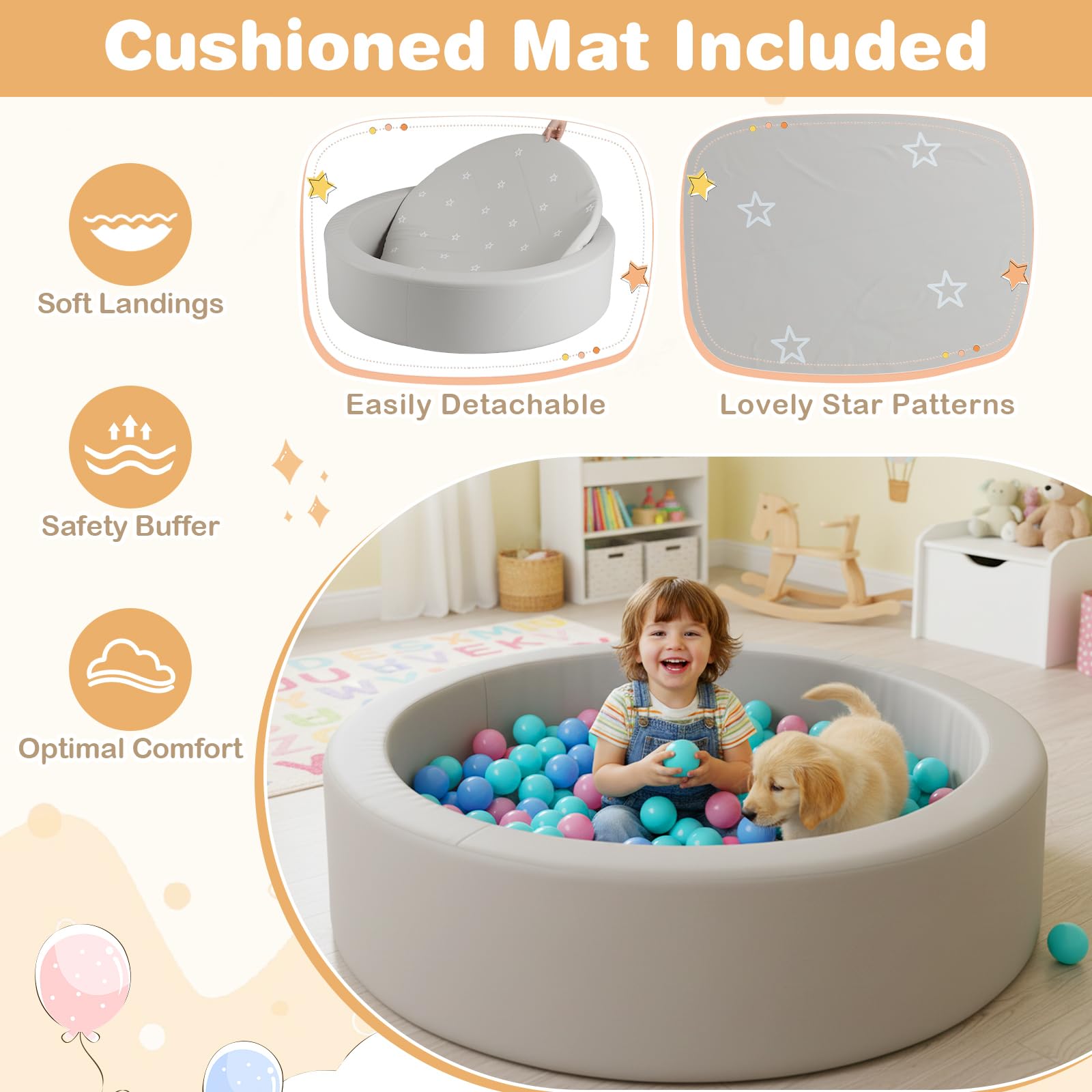 Create a fun and safe play haven with this toddler ball pit, crafted from high-quality materials that are both skin-friendly and supportive. Packed with 200 vibrant ocean balls, it encourages color recognition as well as imagination and pretend play, stimulating sensory and tactile skills. Designed for optimal comfort, the cozy space features padded walls and a comfortable mat, ensuring safety first, smiles always. Its easily detachable PU leather cover resists spills and wipes clean effortlessly, making it a stress-free choice for busy parents. The ball pool is adorned with playful star motifs. Also, it is ASTM and CPSIA compliant and built to be long-lasting. Beyond an exciting play zone, it doubles as a handy toy organizer. When stored flat, simply fluff with pillows, use a hair dryer, or wait 72 hours to restore its shape.