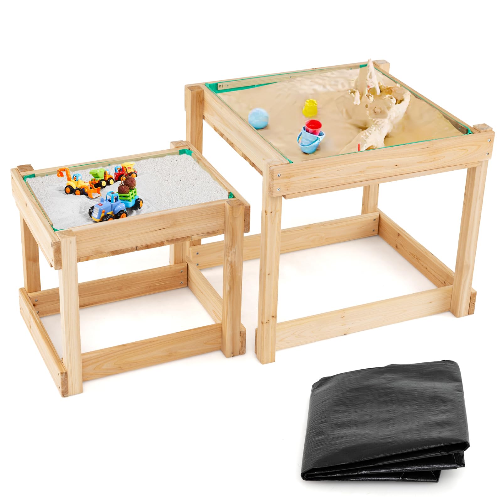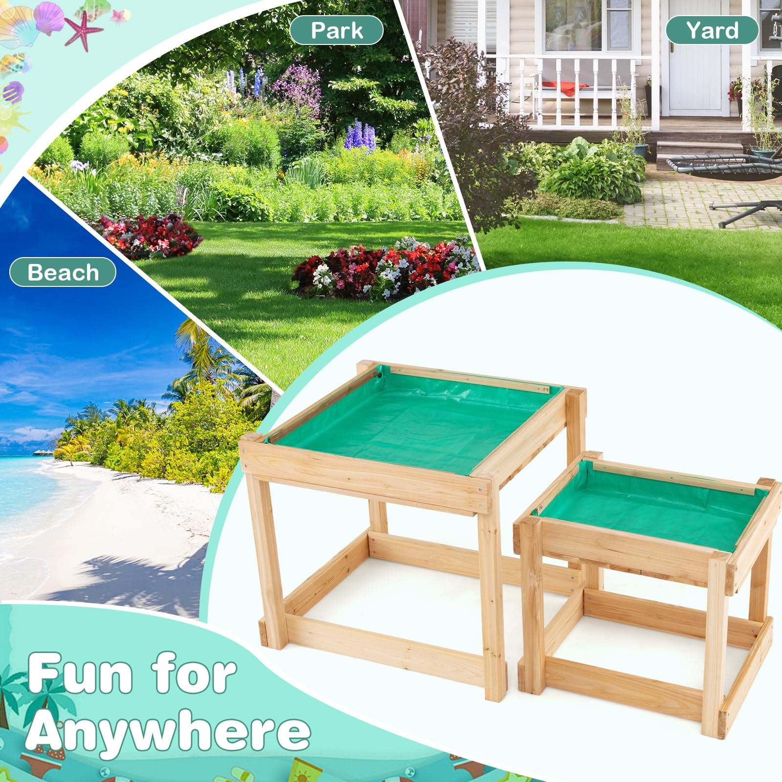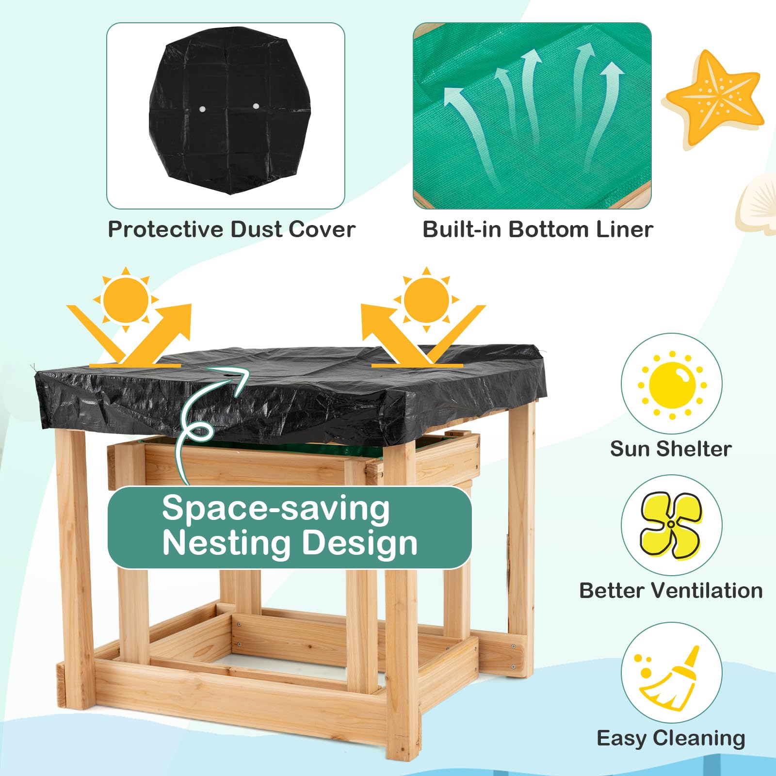 Our wooden sand tables have 2 sizes, great for kids with different heights to play sand, blocks or cultivate plants together. The provided cover offers better shelter and prevents dirt or debris from getting into the sandbox. With bottom liners, kids can gather all the toys into the sandbox and quickly finish the cleaning when playtime is over. Better still, space-saving nesting design ensures the smaller sand table can be completely tucked under the larger table. Children can play them in the park, sandbox, playground, beach, garden, pool party, backyard and wherever.