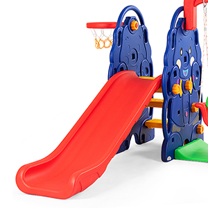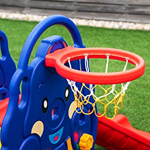Designed just for toddlers, the 4-in-1 climber features a smooth slide, a sturdy swing and a basketball hoop and your kids can play with their friends.