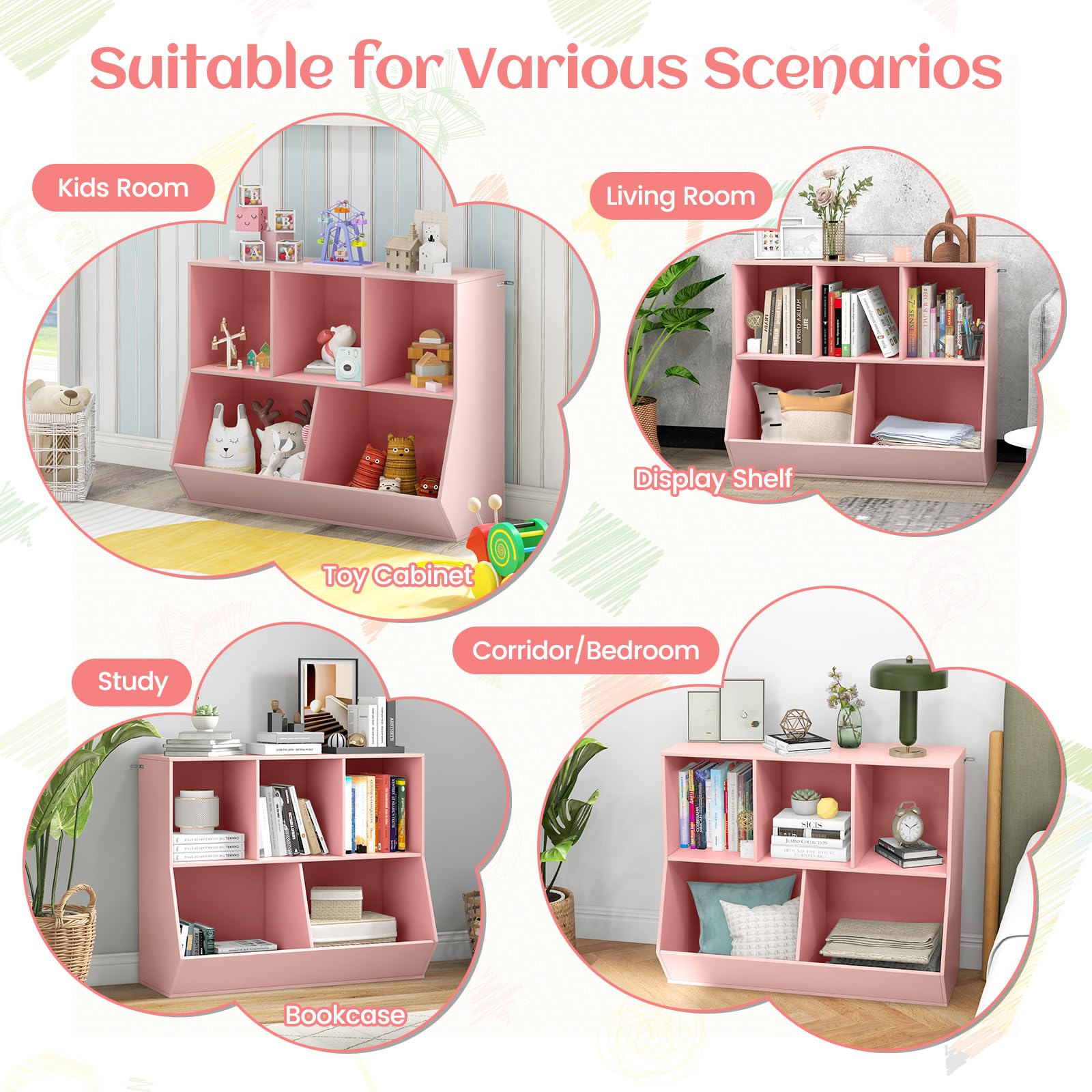 Our toy shelf provides a practical storage solution for your child's room. With a spacious top, 3 open cubbies, and 2 compartments featuring guard boards, this shelf offers ample storage space for toys and games. The design includes a child-friendly height and rounded edges to ensure safety for your little ones. Crafted from premium thickened boards, this kids organizer is durable and sturdy for long-term use. It is equipped with anti-toppling devices at the back to enhance stability and safety during daily activities. You can encourage your child to develop good organizational habits with it. Invest in this versatile storage solution that provides value for your money!
