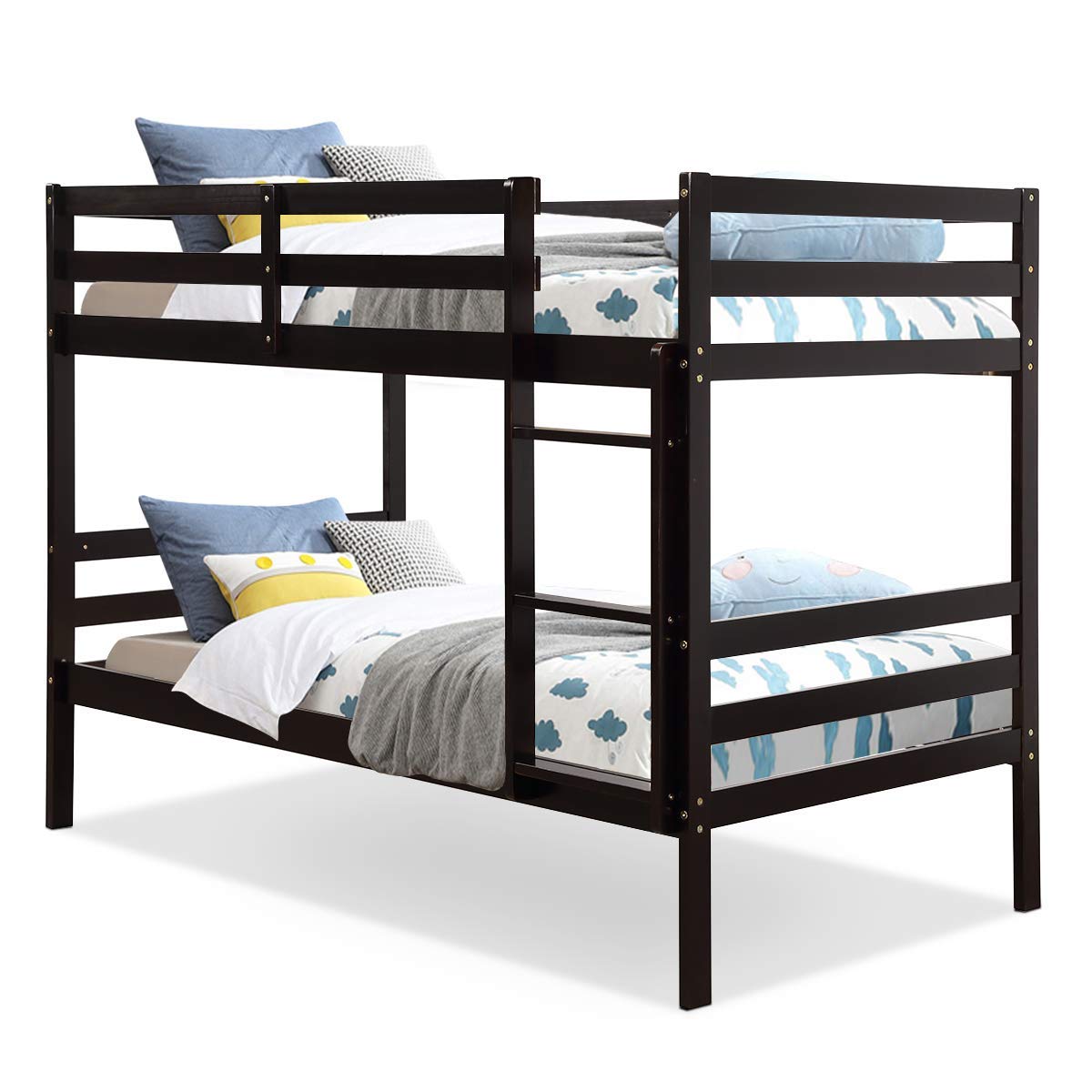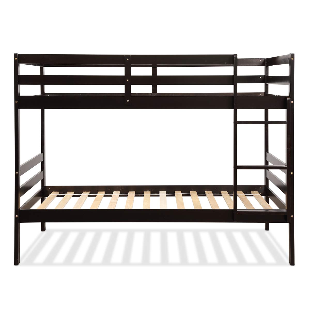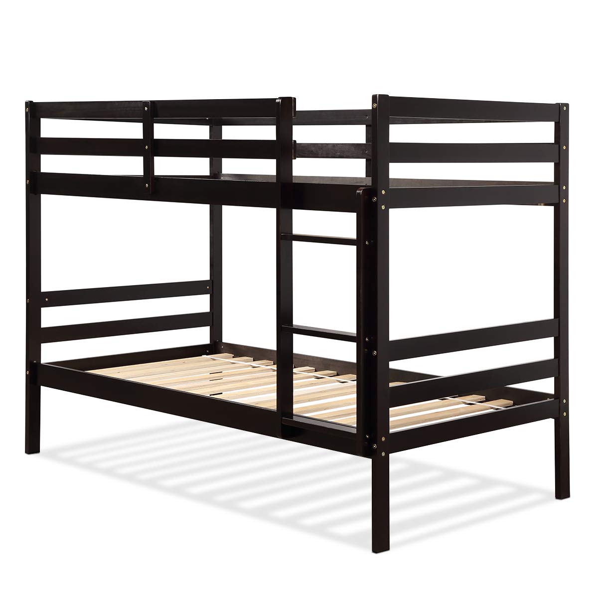 Want a wood twin bunk bed for your kids which has unparalleled quality ? This bunk bed comes with a awesome looks and elegant style to satisfy your demands. The wood bunk bed will match any type of homes from modern to traditional style. The bunk bed is made of sturdy wood for optimized strength and long-lasting durability. The 28 bed slats ensure the bearing capacity of the bed and the safety of the users. Besides, safe guardrail and metal brackets are also designed for users' safety. More importantly , the space-saving twin over twin bed provides extra storage space under the bed. So order now and bring your kids a beautiful twin bunk bed and enjoy the quality and comfort.