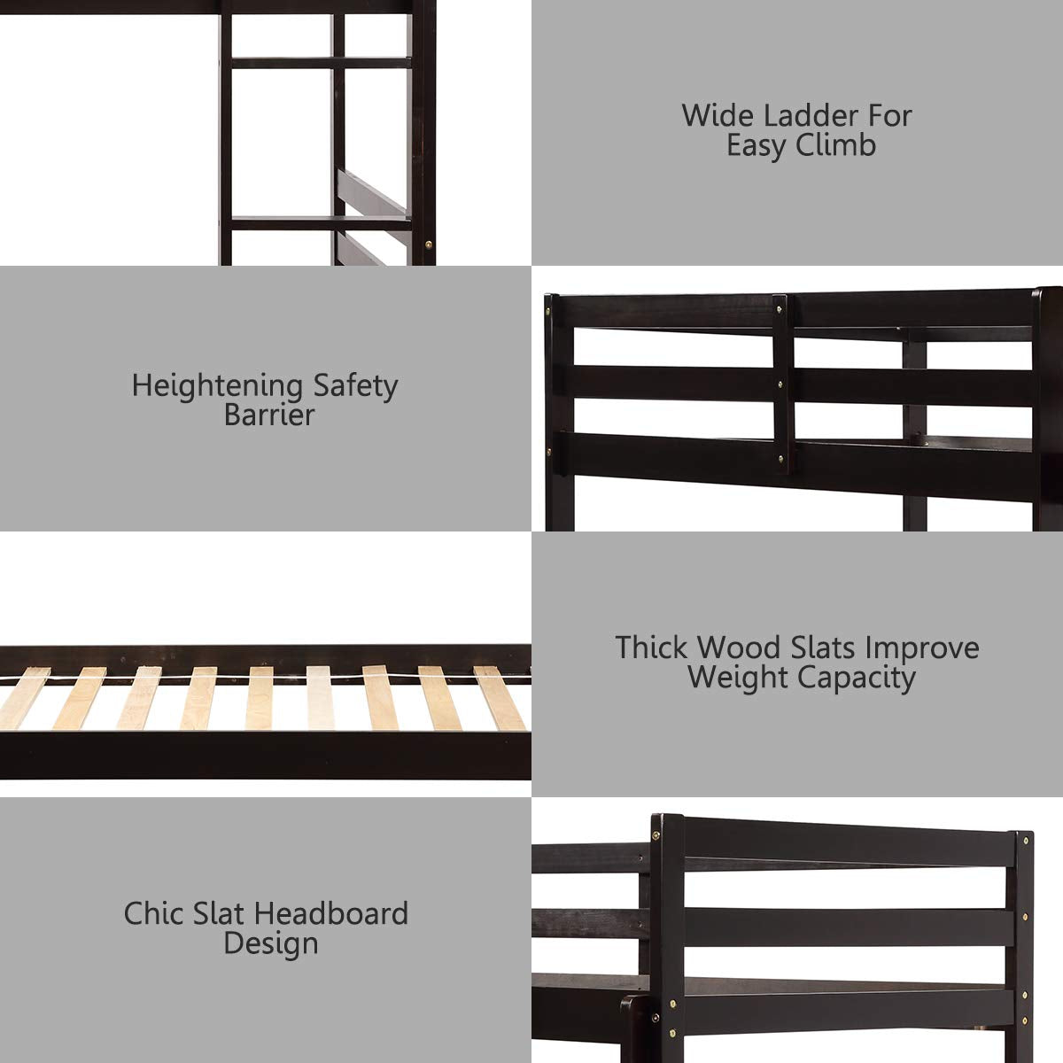 - ?Rugged Structure of More Slats: The bunk bed is made of high quality and solid wood with superior craftsmanship for optimized strength and long-lasting durability. Besides, different from other bunk beds, the bunk bed increases the number of bed slats, which not only improves the load bearing capacity but also ensures the safety of use.
