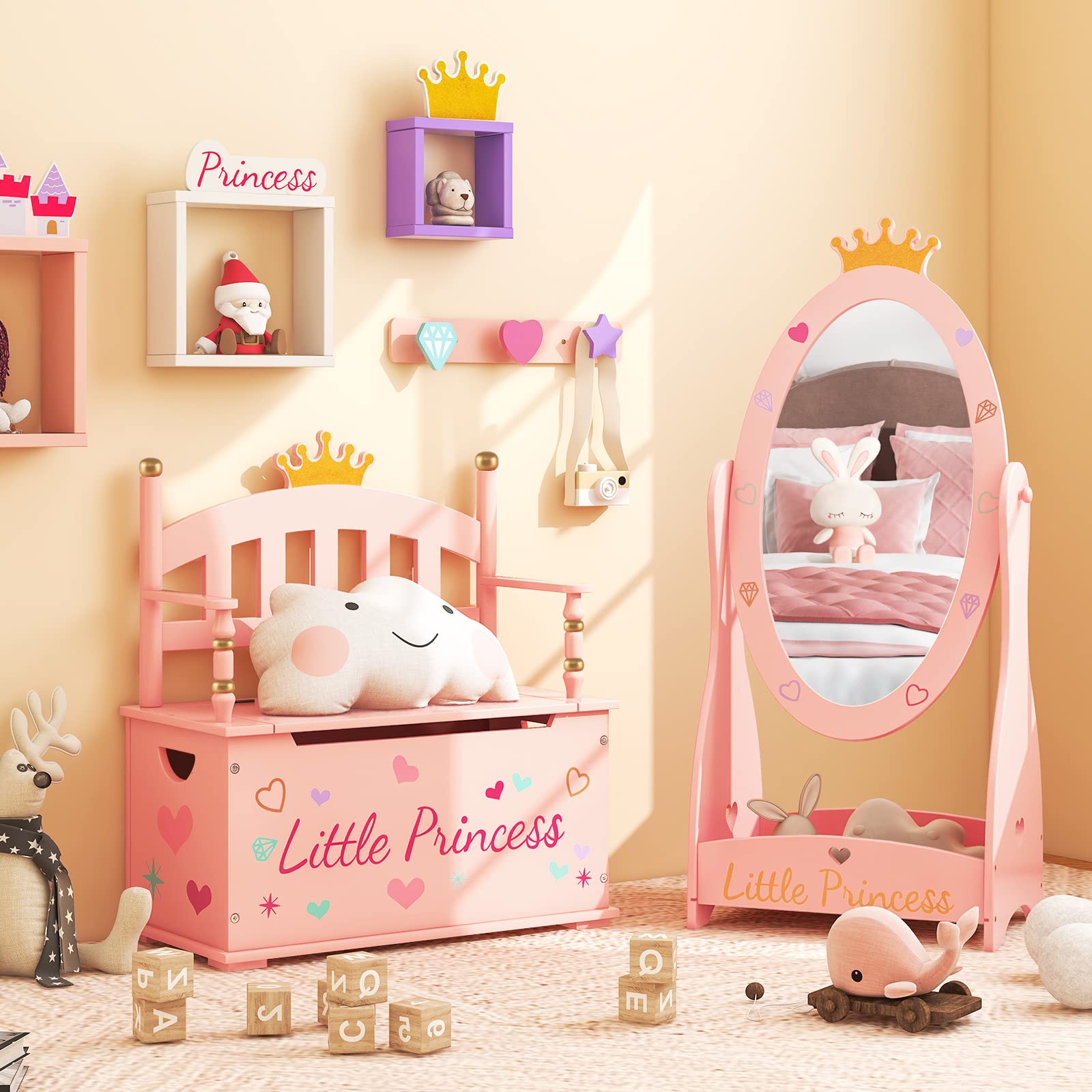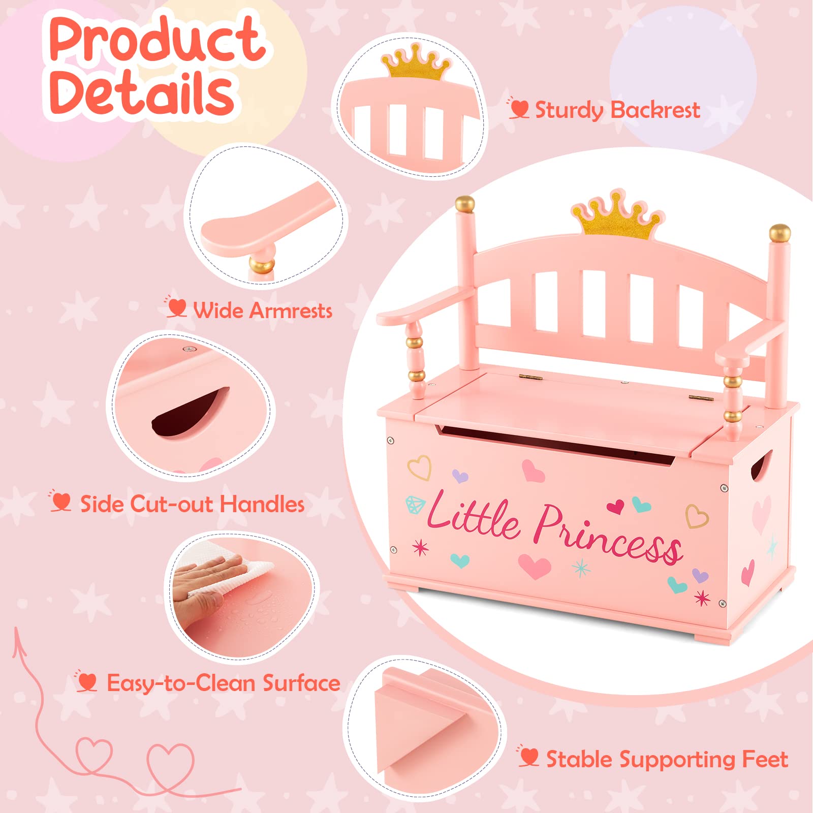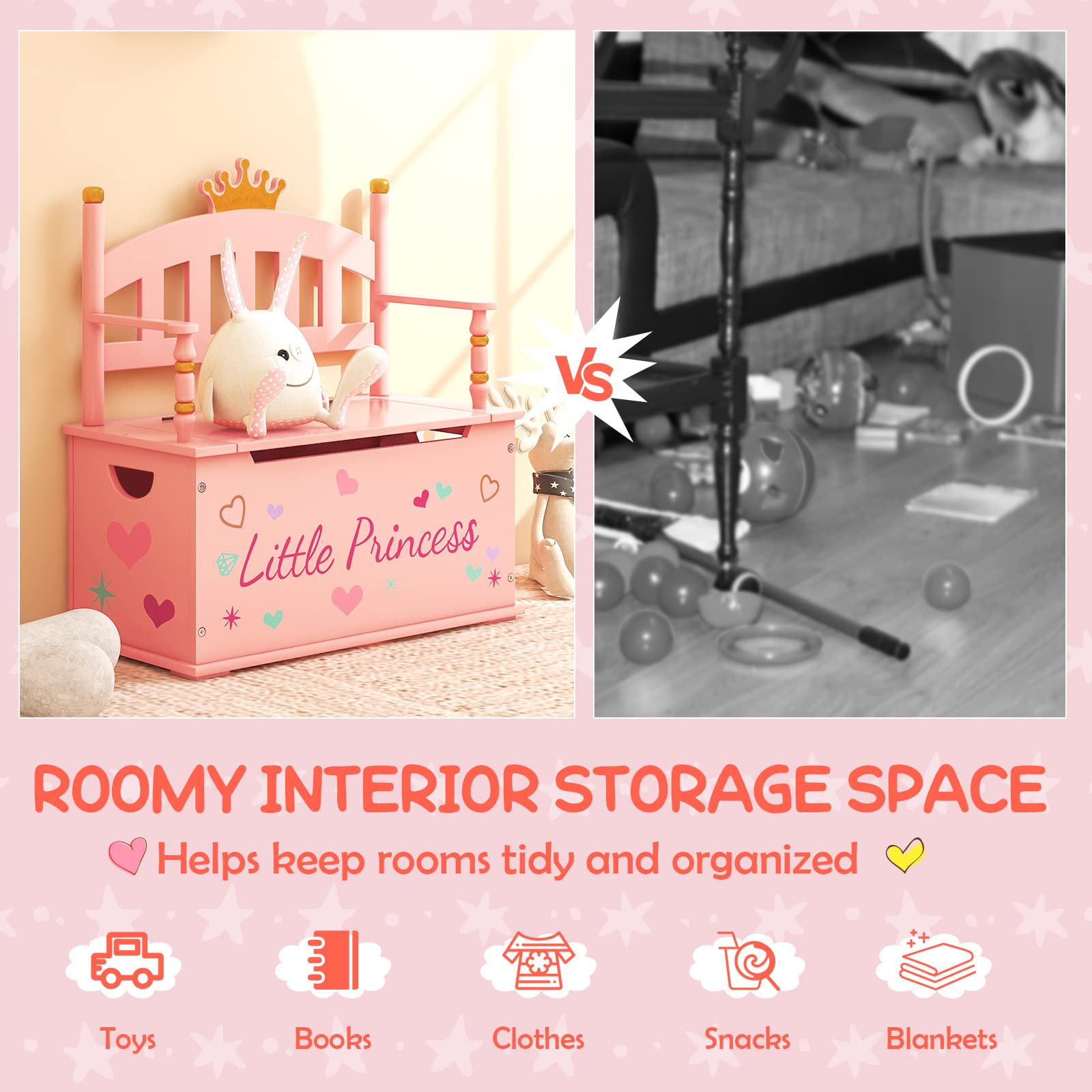 This toy box not only provides ample storage space for kids' toys, books, clothes, snacks, and blankets to keep the room tidy & organized but also teaches kids how to organize their supply themselves. Besides, the high backrest and smooth armrests offer great support and comfort for kids to relax on the bench. The safety hinge prevents the lid from suddenly closing and protects your kid's fingers. As for quality, made of thick and durable MDF with premium paint, this toy storage bench ensures high stability and long service life. What's more, with its adorable appearance and practical design, this toy chest is ideal for your child's bedroom, playroom, nursery, and more.