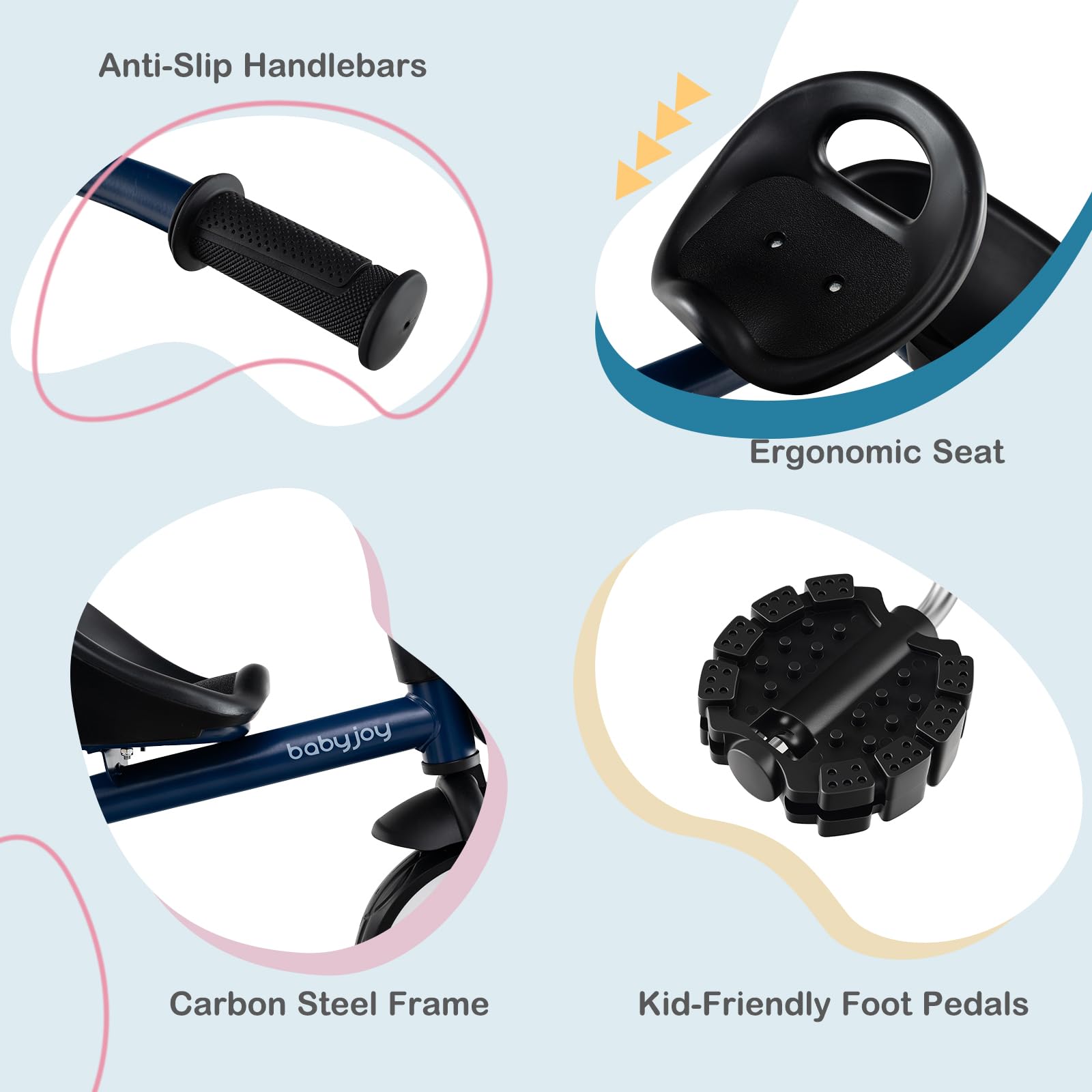 With an adjustable seat for personalized comfort, this toddler trike caters to children between 1.5-5 years old. The 3-wheel stability, along with the 110° limit steering, allows the kids tricycle to keep stable. Featuring premium EVA wheels, the toddler bike is suitable for both indoor and outdoor adventures. The baskets at the front and back provide generous storage space for children’s toys and snacks. This toddler tricycle complies with ASTM and CPSIA, serving as a perfect gift option for little explorers to enjoy riding and enhance their motor skills.
