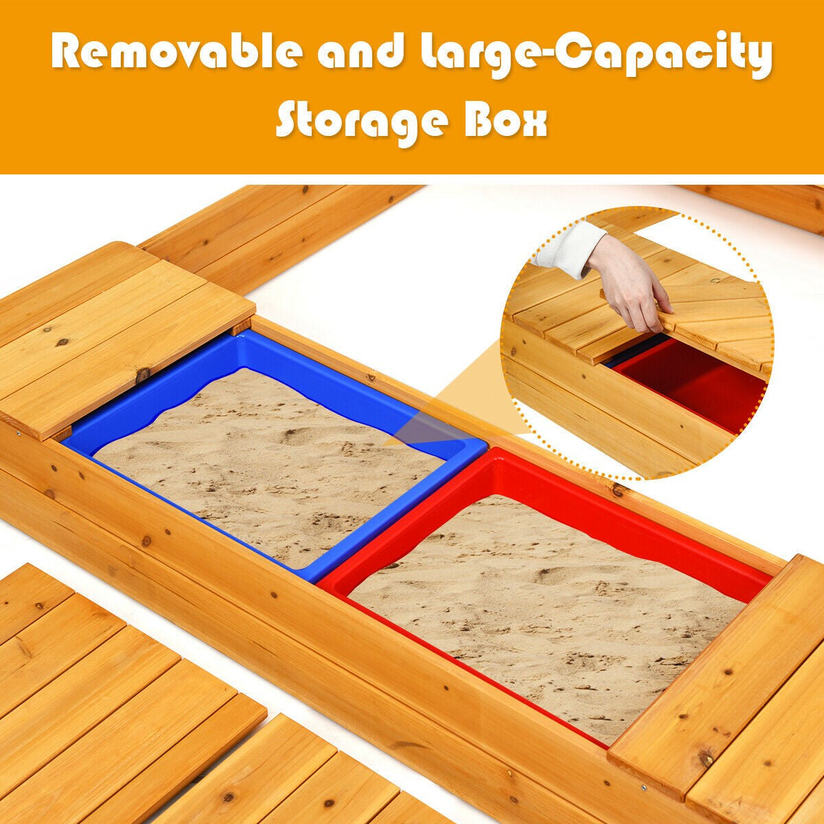 Do you want to bring more joy and smile to your kids? Our sandbox provides enough space for kids to dig, build and explore to develop their creativity and collaboration. There are two large-capacity plastic storage boxes that can be used to store children's toys and snacks. And the seats have a strong load-bearing capacity for multiple kids to sit and play. The bottomless construction facilitates drainage, ventilation and adjustment of the depth of the sand. Made of premium fir, the sandbox has good weather resistance, so you can put it in the yard, lawn and beach.